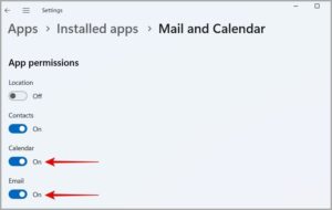 - Turn on the Email option in the App Permissions section. You must also provide the app access to your Calendar because Mail and Calendar are linked together on Windows.
