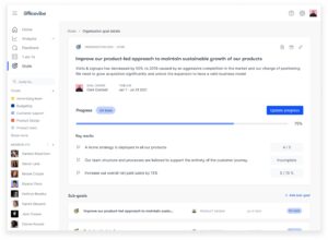 Betterworks’ Insights tab provides a picture summary of OKR development, development, changes, and even assigns a “motivation” score based upon previous patterns. Betterworks combines OKRs, coaching conversations, and real-time feedback to assist align and focus staff members on strategic top priorities. Betterworks likewise uses insights and analytics, staff member engagement, and finest practices for program design, modification management, and adoption.