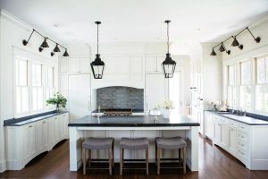 Soapstone countertops lend distinction to this crisp, white kitchen in an Indiana farmhouse restored by Leo Designs, an interior layout firm situated in Chicago, Illinois. According to the cooking space’s Americana vibe are vintage-inspired accessories including the overhead lighting. Also, check full house cleaning services.